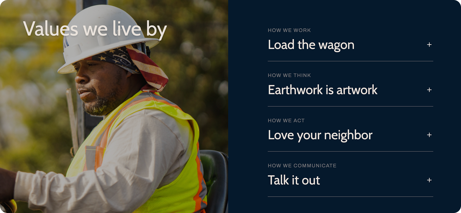 From utility contractors and equipment dealers to demolition companies and heavy civil contractors, Fieldwrk helps companies in essential industries write values that feel authentic and resonate across teams. As examples, check out the values we helped Midwest Machinery (top) and Abernathy Contracting (bottom) to create: